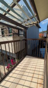 二階のベランダは塩害への配慮から山側に配置されていて洗濯機を置ける幅もあり、